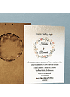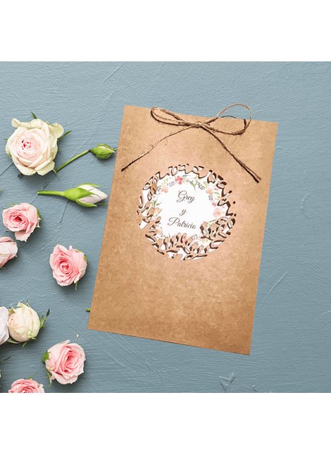 Troquelado central que deja ver el círculo floral con nombres de los novios