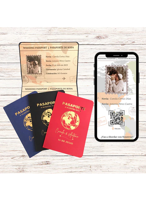 - 20 invitaciones físicas modelo Pasaporte, inspiradas en los pasaportes internacionales, con detalles en folia metalizada que le dan un brillo sofisticado y moderno.